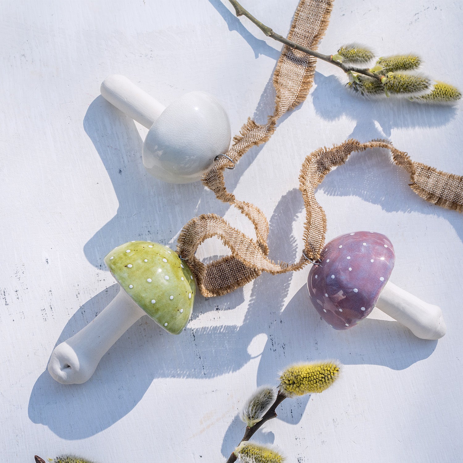 Ručně vyráběné a dekorované houbičky k zavěšení. Hlavičky jsou dekorované duhovými efektními glazurami do tónů růžovofialové, oranžové s černými tečkami, zelené s černými tečkami a mramorované fialovo-modré.