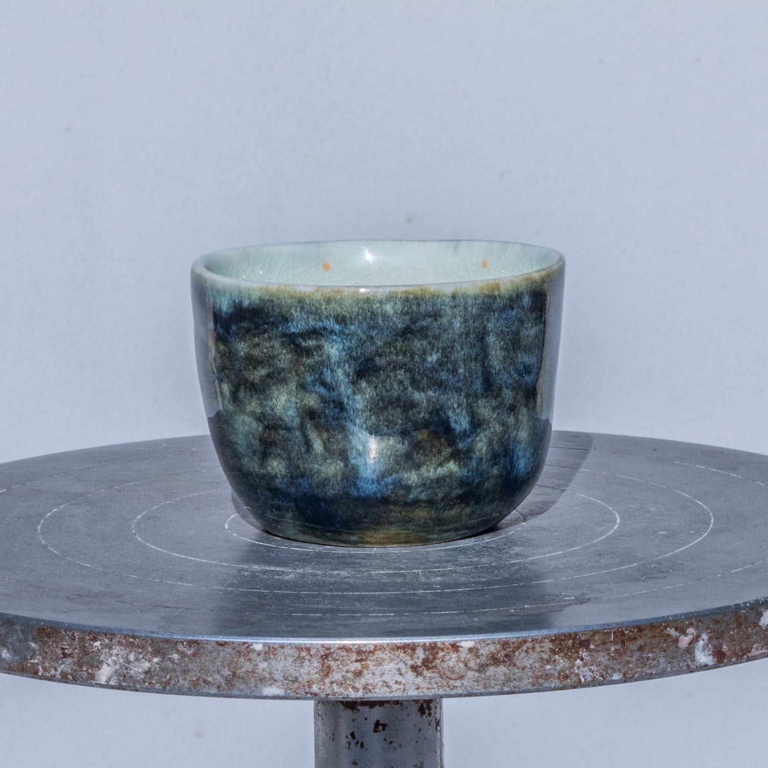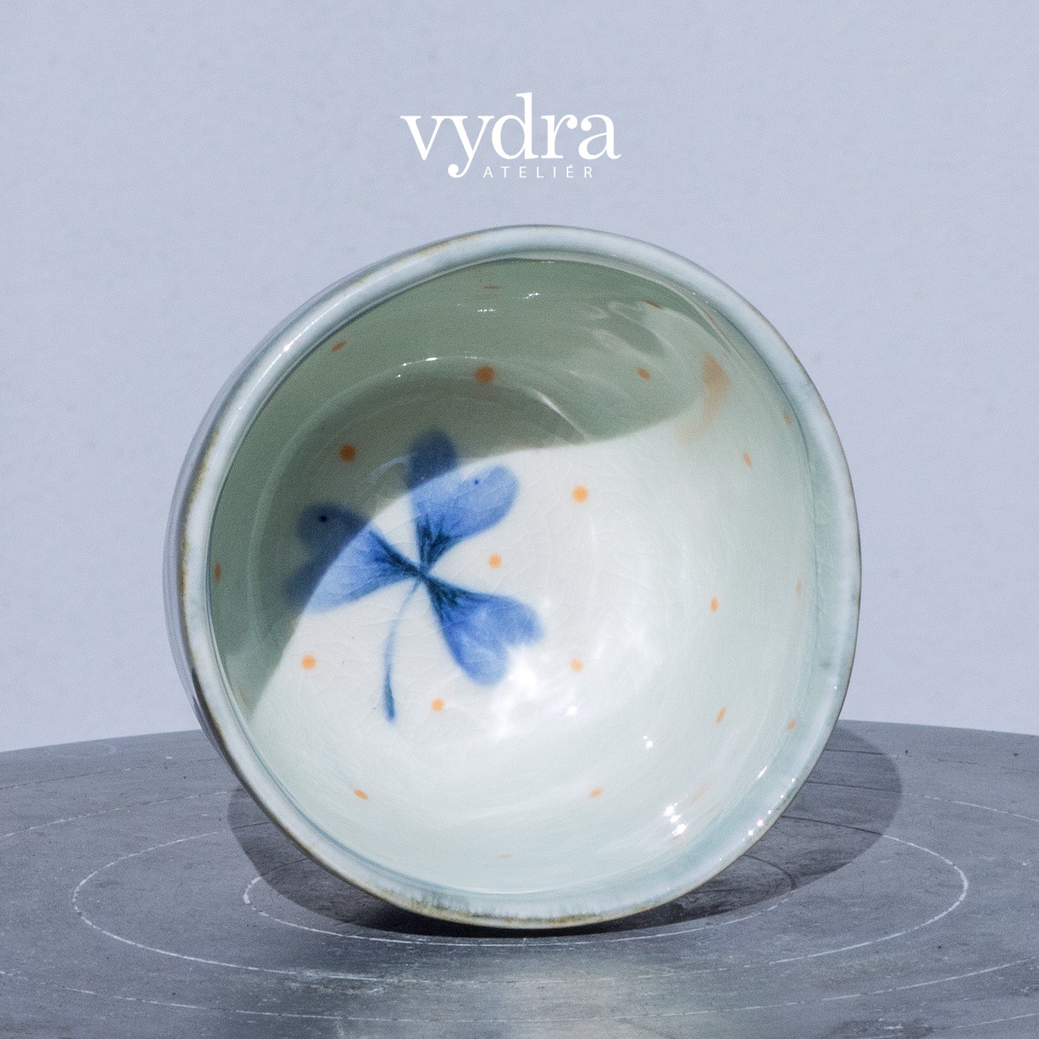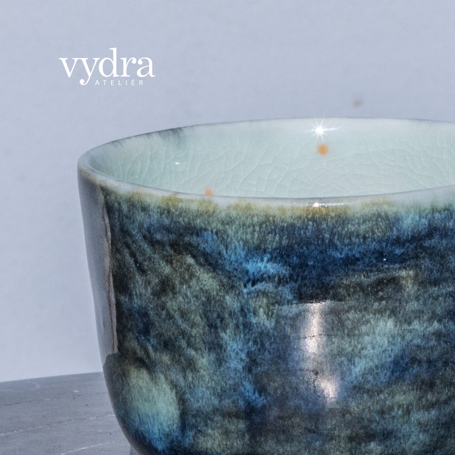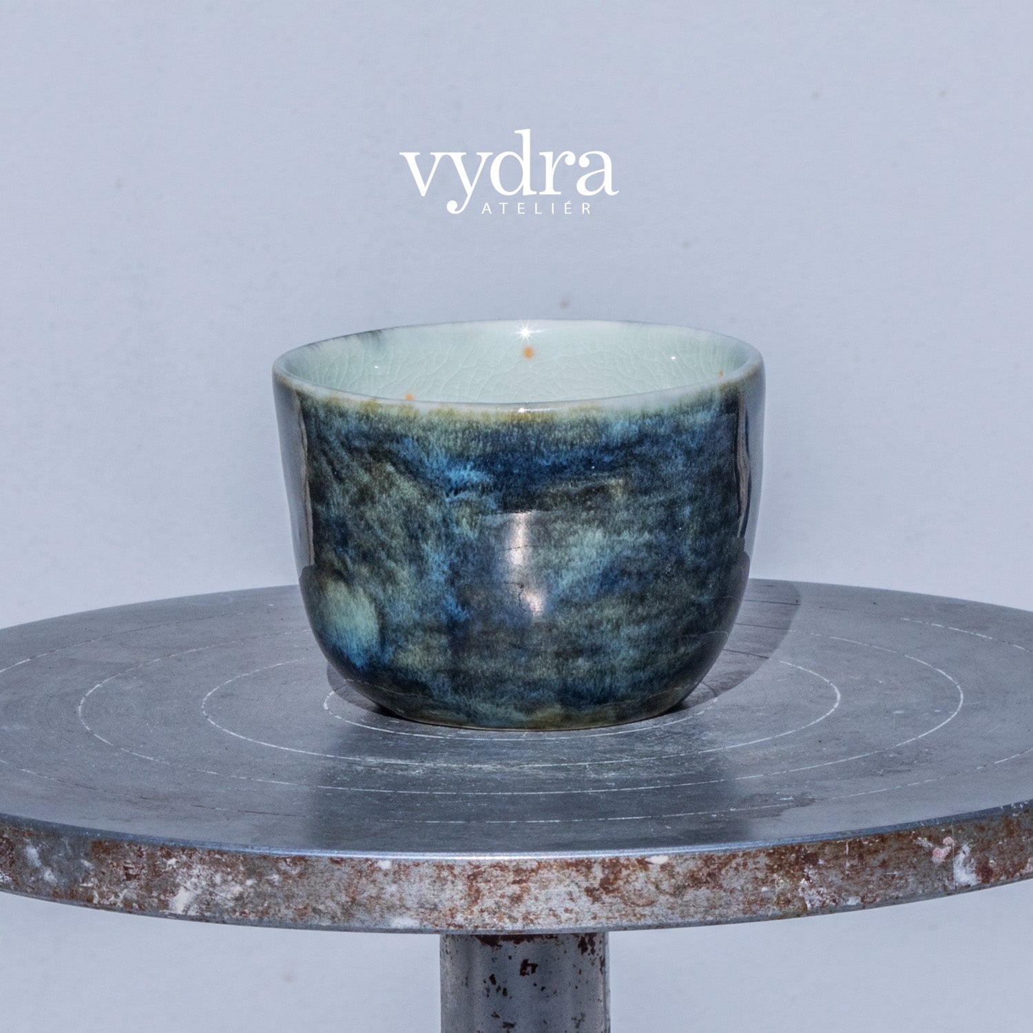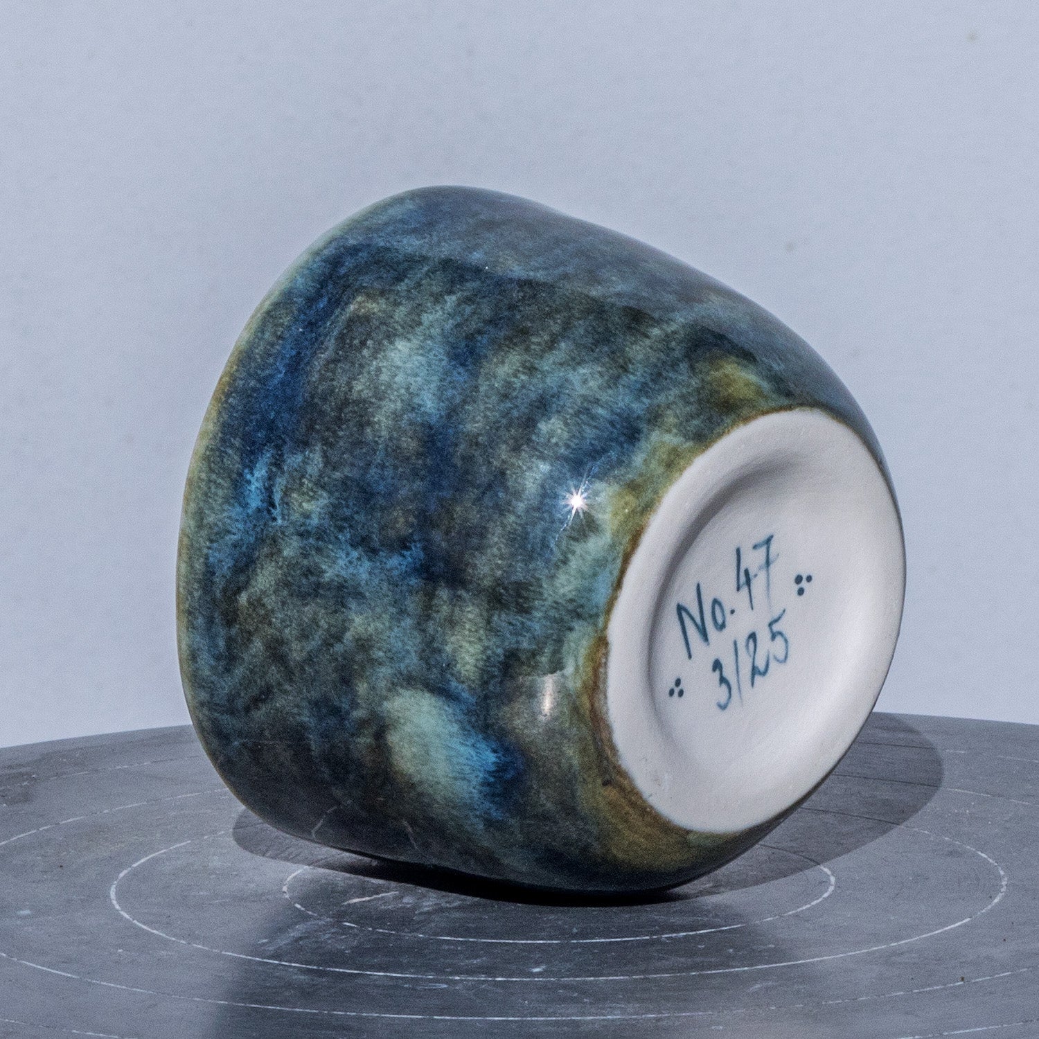 Ručně malovaný pohárek na espresso. Z vnějšku je glazovaný efektní výrazně mramorovanou temně modrou glazurou, vnitřní část je smetanově bílá snádechem modré, zdobená precizní ruční malbou, kombinující techniku akvarelu a podglazurní malby.