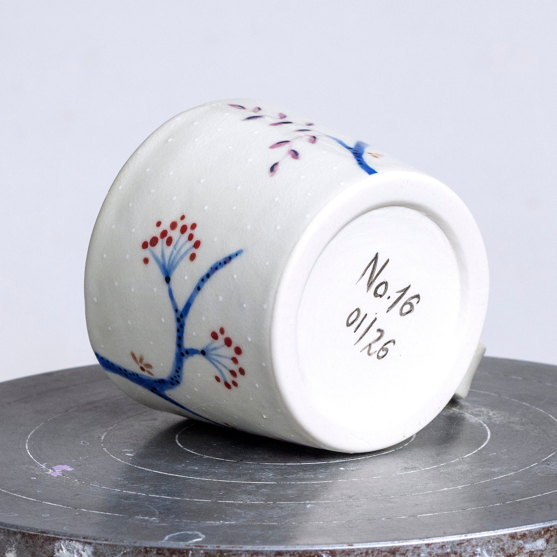 Ručně malovaný porcelánový hrnek. Vnitřek je glazovaný efektní modrozelenou glazurou, vnější část je smetanově bílá, zdobená precizní ruční malbou, kombinující techniku akvarelu, majoliky a vyškrabávání.