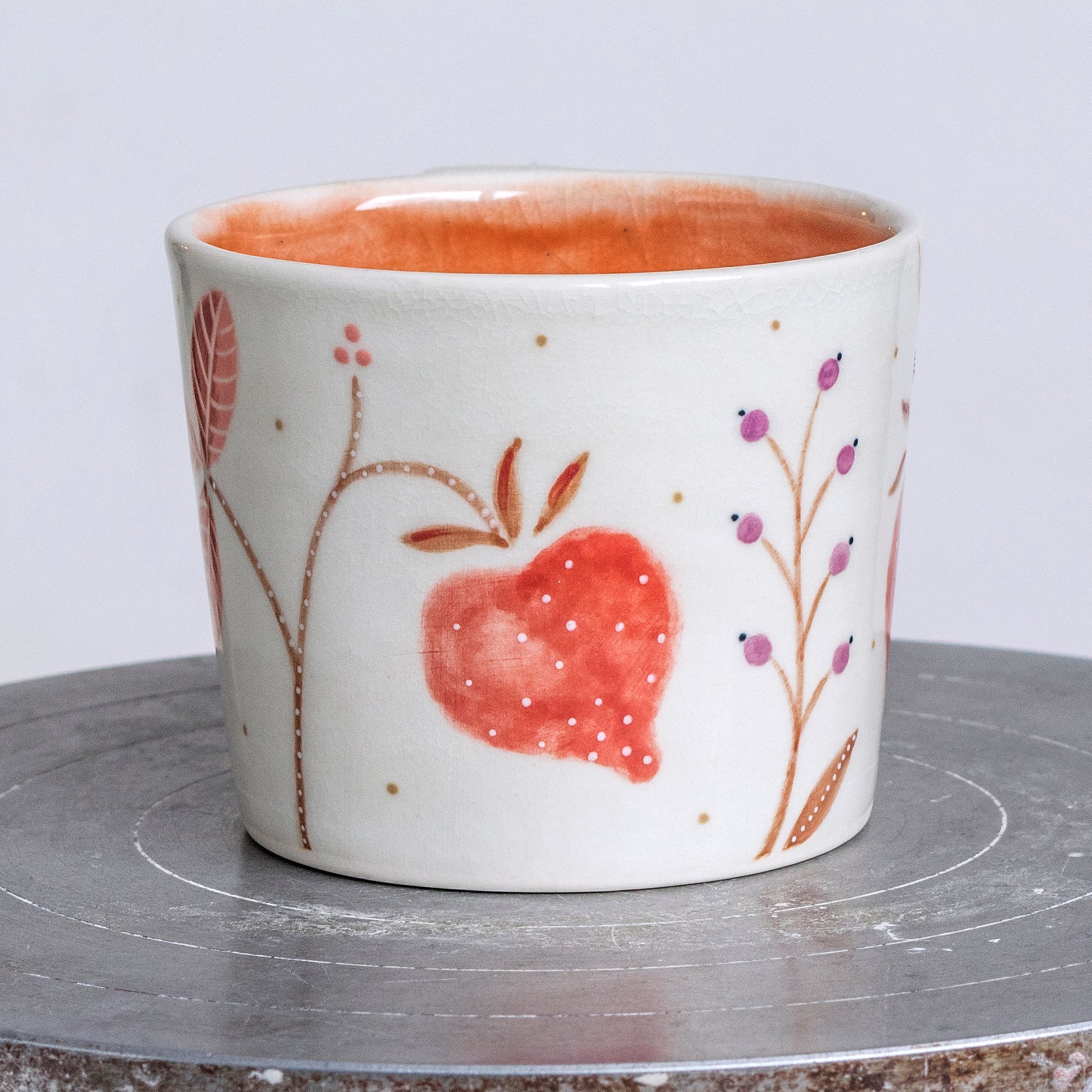 Ručně malovaný porcelánový hrnek. Vnitřek je glazovaný efektní světle oranžovou glazurou, vnější část je smetanově bílá, zdobená precizní ruční malbou, kombinující techniku akvarelu, podglazurní malby a proškrabávání.