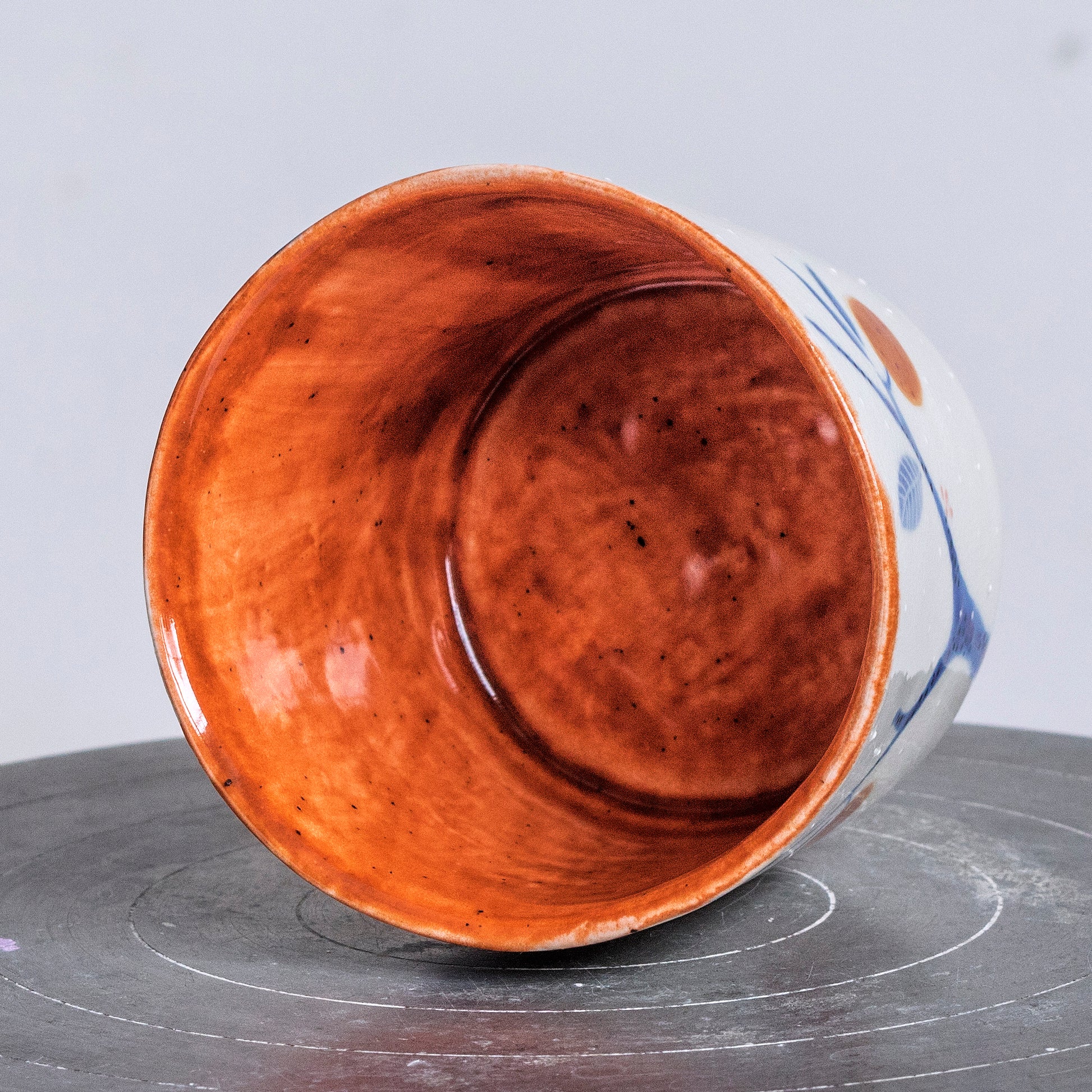 Ručně malovaný porcelánový pohár. Vnitřek je glazovaný efektní cihlově oranžovou glazurou, vnější část je smetanově bílá, zdobená precizní ruční malbou, kombinující techniku akvarelu, podglazurní malby a proškrabávání.