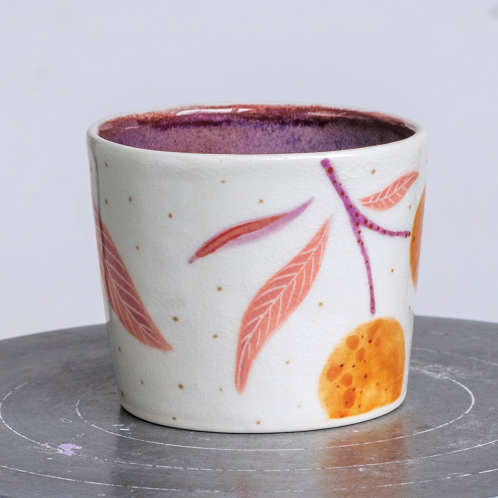Ručně malovaný porcelánový pohár. Vnitřek je glazovaný efektní šedofialovou glazurou, vnější část je smetanově bílá, zdobená precizní ruční malbou, kombinující techniku akvarelu, podglazurní malby a proškrabávání.