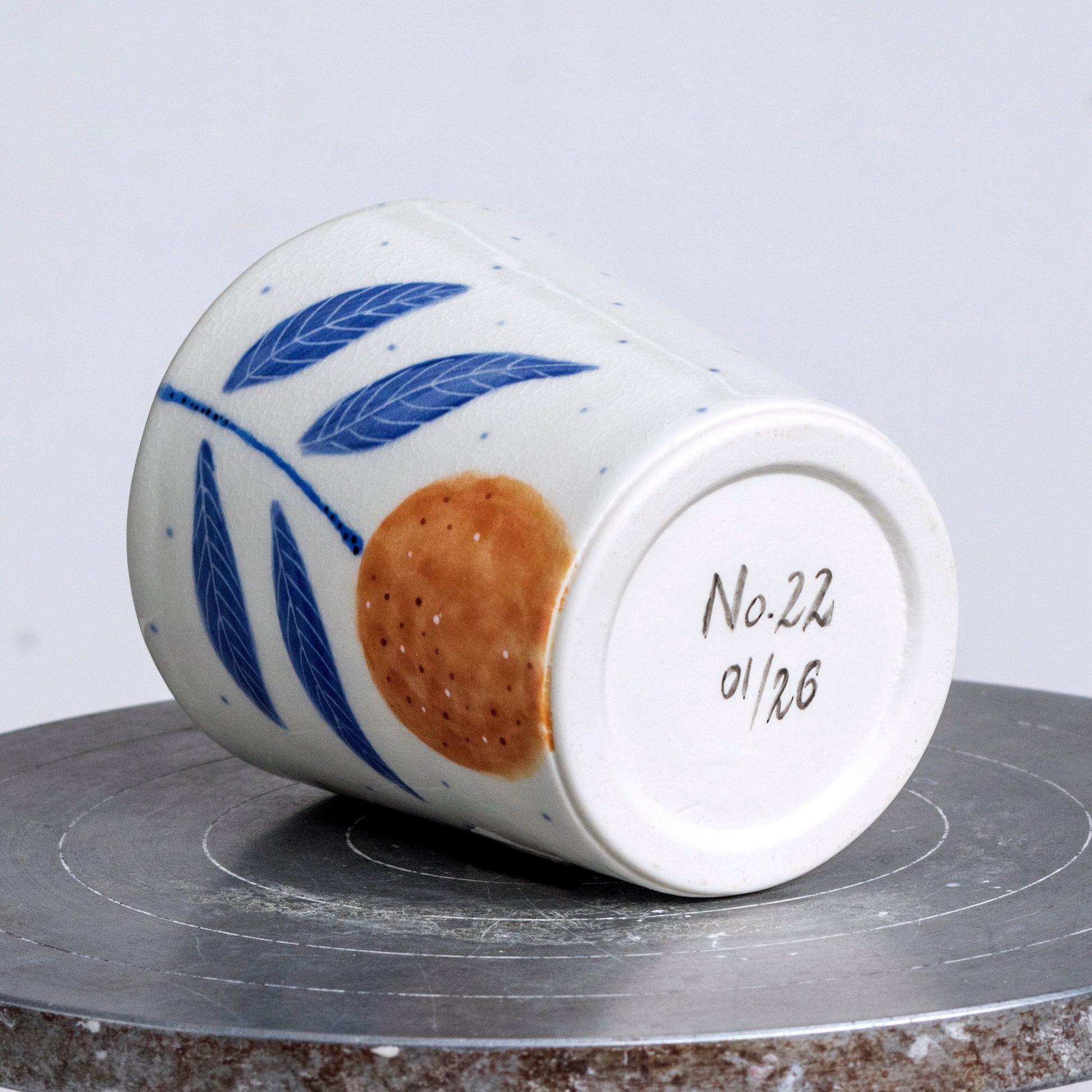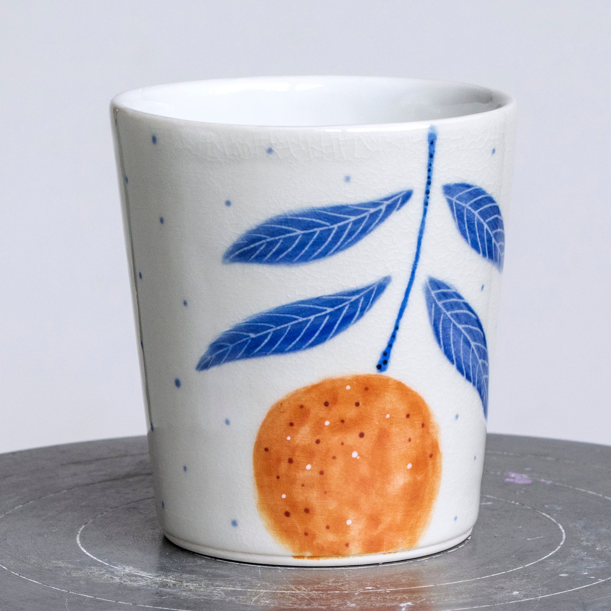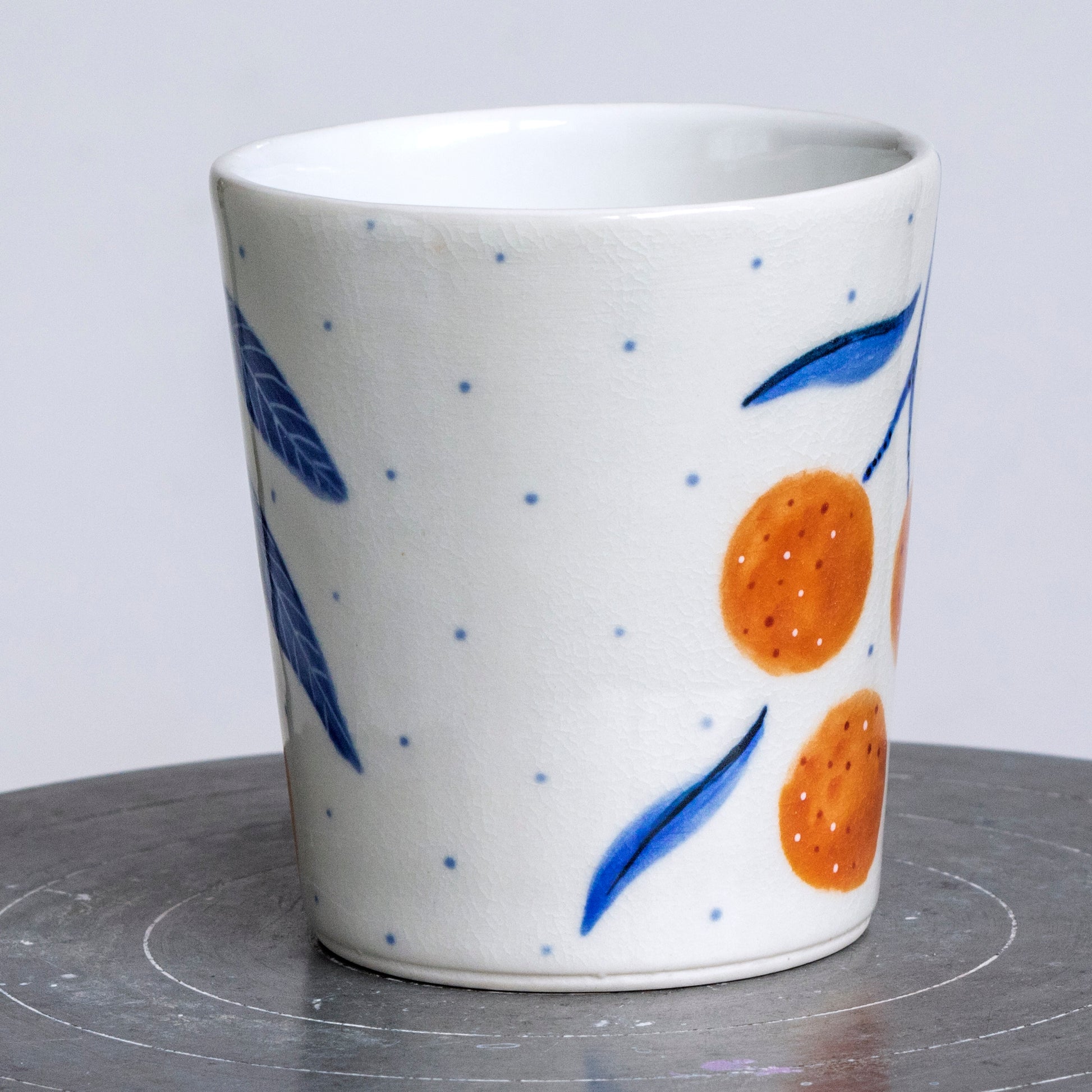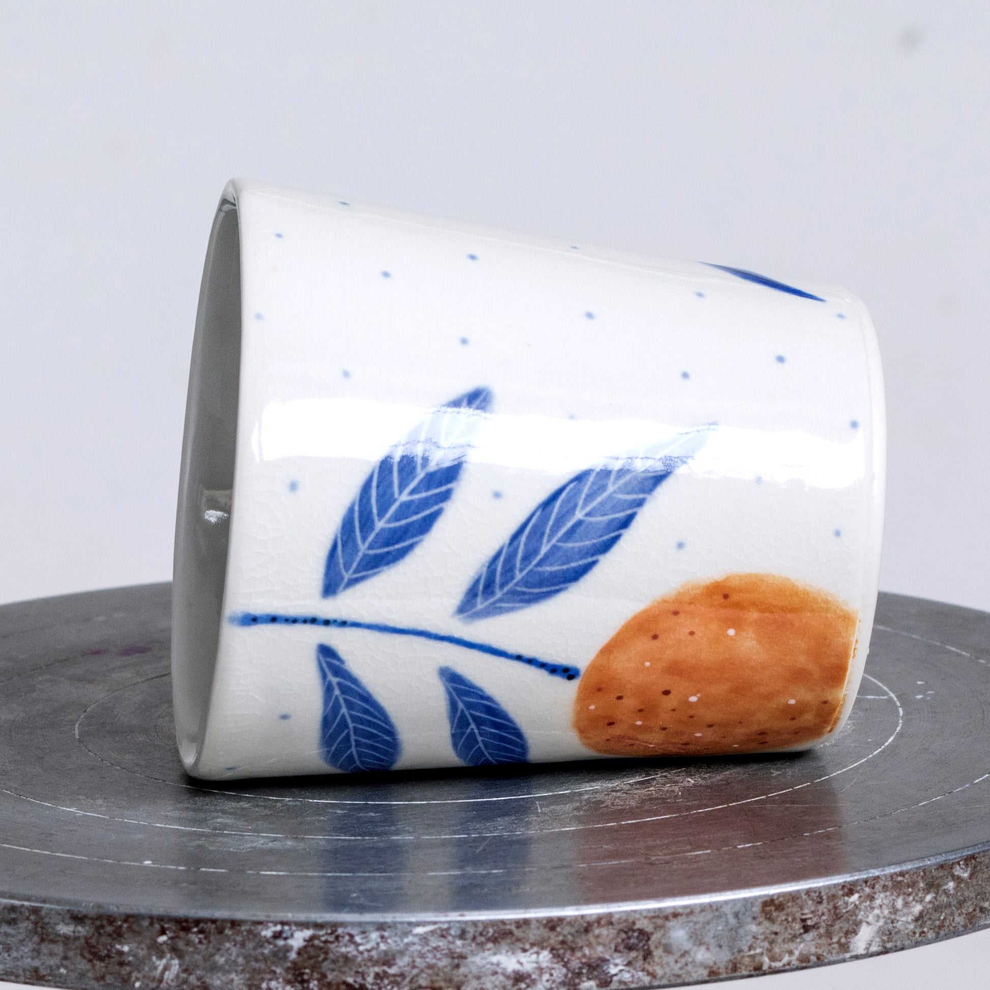 Ručně malovaný porcelánový pohár. Vnitřek je glazovaný čistě bílou glazurou, vnější část je smetanově bílá, zdobená precizní ruční malbou, kombinující techniku akvarelu, podglazurní malby a proškrabávání.